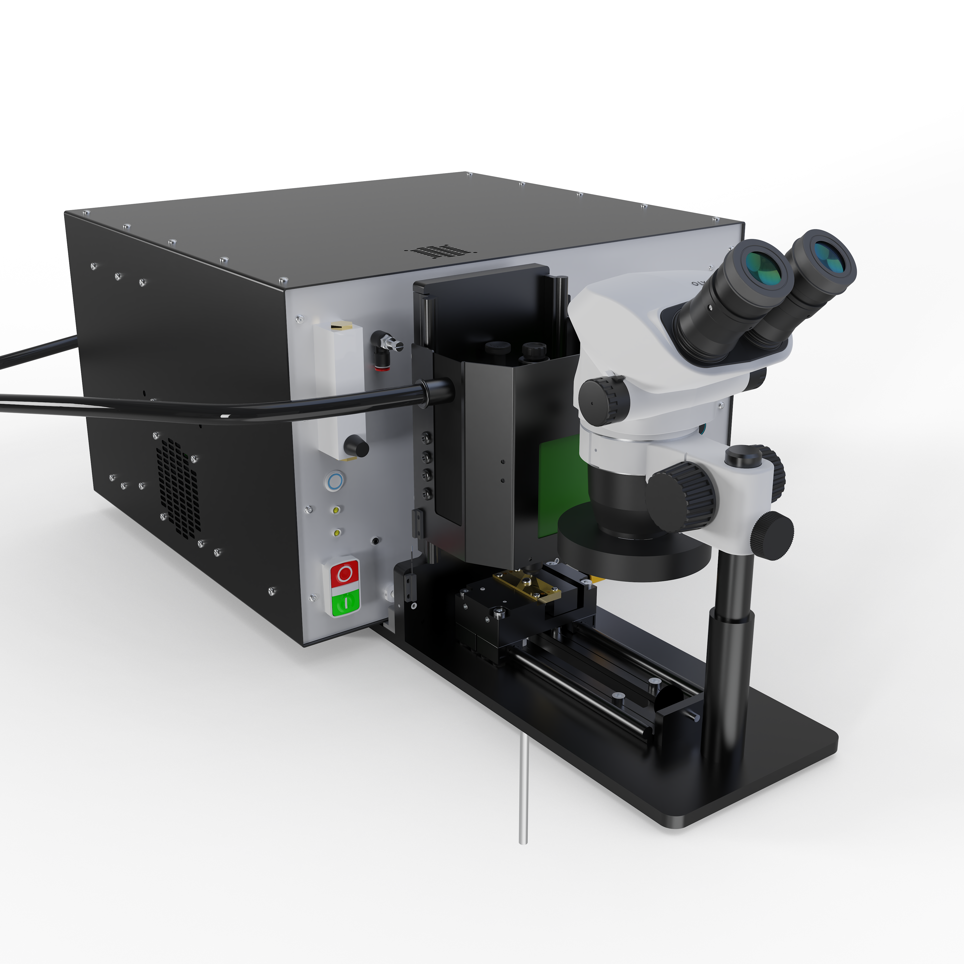 A compact, production-ready welding system combining TIG sheath welding and capacitance discharge (CD) conductor welding into a single precision workstation for thermocouple manufacture. The machine delivers micrometer-accurate weld positioning and consistent weld quality across a wide range of cable diameters. Wear-resistant Elkonite jaw sets are used to withstand the thermal and electrical demands of both TIG and CD welding, ensuring long service life in production environments. A Nikon stereoscopic microscope with high-intensity LED ring illumination provides clear inspection of the weld zone, while a dedicated welding-glass viewing window allows real-time observation during operation. Designed for sustained duty, the system incorporates active forced-air cooling and electrically over-rated key components for reliability.